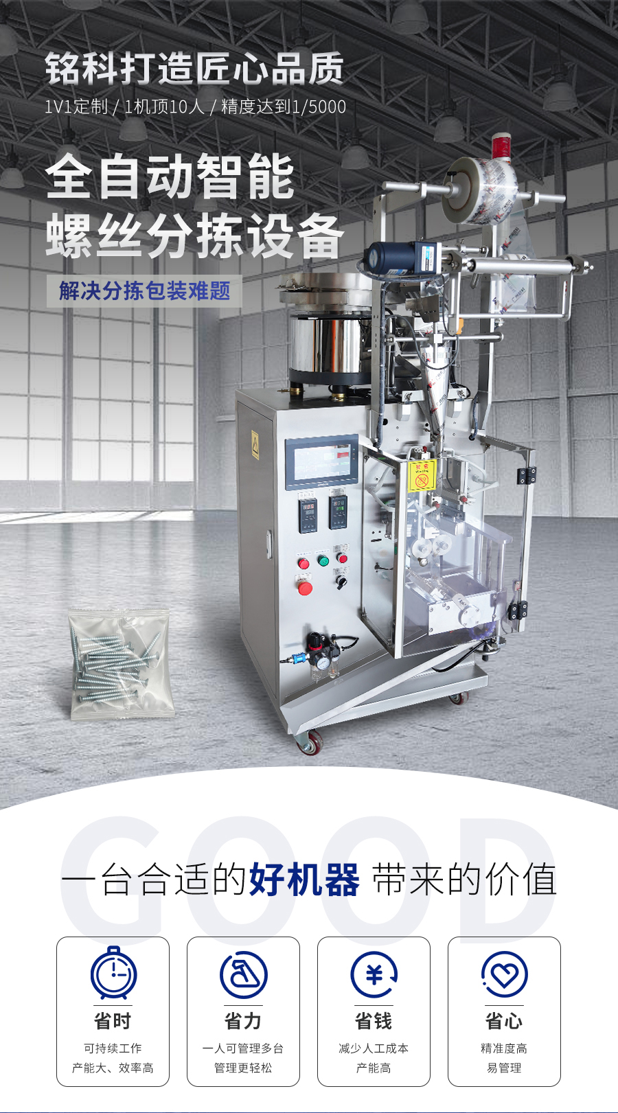 MK-LS1單盤緊固件五金螺絲塑膠配件分揀點(diǎn)數(shù)包裝機(jī)。可廣泛適用于電器、燈飾、五金裝飾產(chǎn)品的附屬安裝螺絲、螺母、小塑膠件的混合包裝。替代了預(yù)制袋成型方式,大大提高了工作效率,,為各螺絲應(yīng)用企業(yè)廣泛采用中,特殊形狀零件也可按客戶要求定制。本機(jī)采用微電腦控制,包裝過程自動(dòng)實(shí)現(xiàn)。