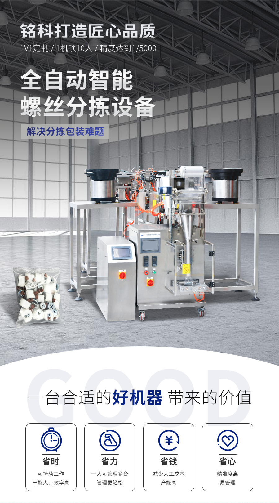 MK-LS5五盤(pán)玩具、電器五金螺絲配件分揀包裝機(jī)。可廣泛適用于汽配、電器、燈飾、家具、玩具、五金裝飾產(chǎn)品的附屬安裝螺絲、螺母、小塑膠件的混合包裝。替代了預(yù)制袋成型方式,大大提高了工作效率,,為各螺絲應(yīng)用企業(yè),廣泛采用中,特殊形狀零件也可按客戶(hù)要求定制。本機(jī)采用微電腦控制,包裝過(guò)程自動(dòng)實(shí)現(xiàn)。