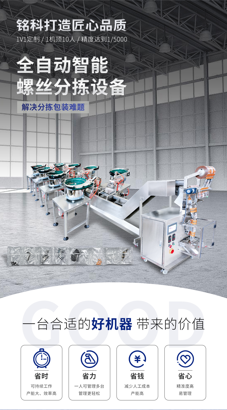 MK-LS8八盤五金螺絲拖斗式分揀包裝機(jī)。可廣泛適用于家具、電器、燈飾、五金裝飾產(chǎn)品的附屬安裝螺絲、螺母、小塑膠件的混合包裝。替代了預(yù)制袋成型方式,大大提高了工作效率,,為各螺絲應(yīng)用企業(yè),廣泛采用中,特殊形狀零件也可按客戶要求定制。本機(jī)采用微電腦控制,包裝過(guò)程自動(dòng)實(shí)現(xiàn)。