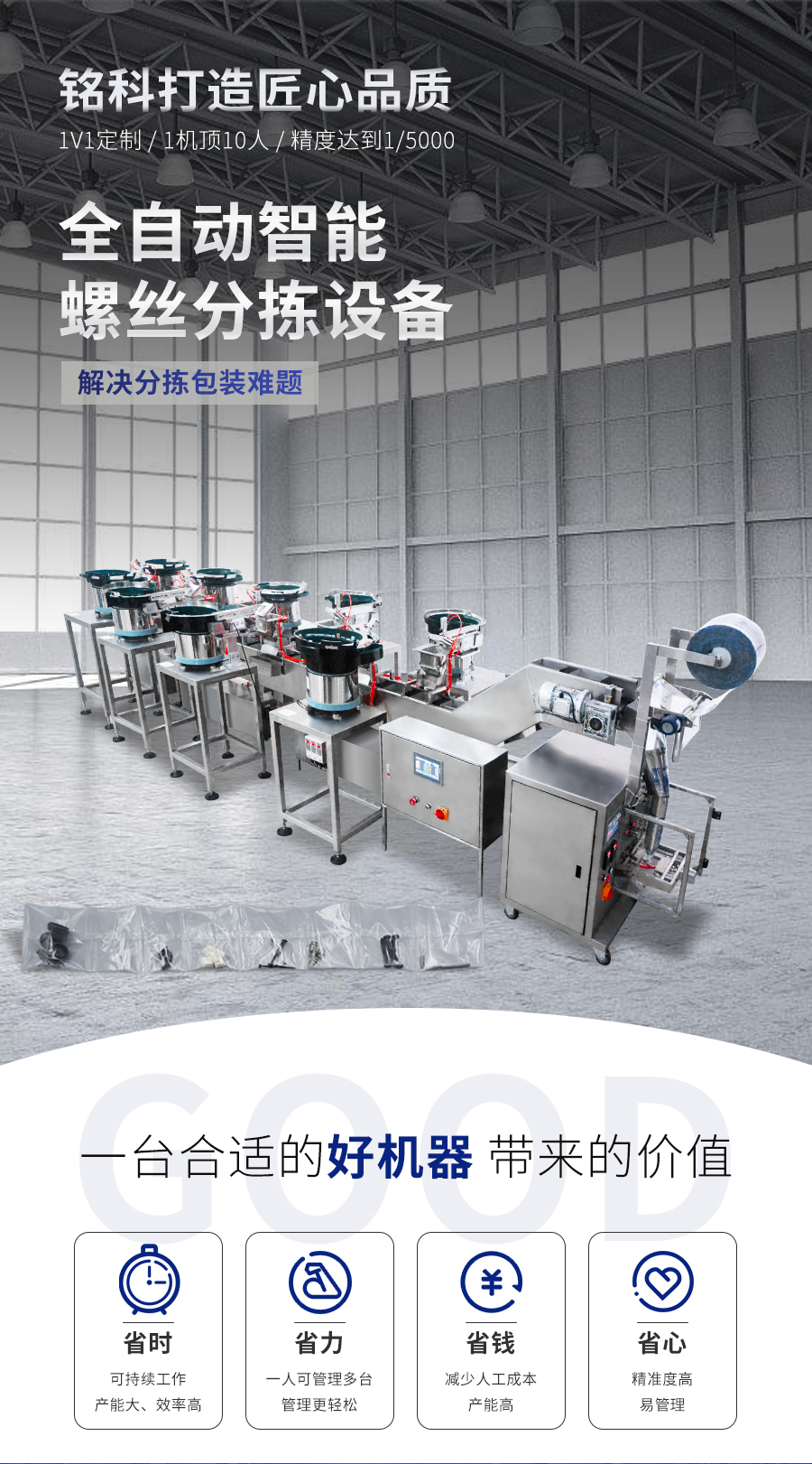 MK-LS9九盤拖斗式五金螺絲分揀包裝機。可廣泛適用于家具、電器、燈飾、五金裝飾產品的附屬安裝螺絲、螺母、小塑膠件的混合包裝。替代了預制袋成型方式,大大提高了工作效率,,為各螺絲應用企業(yè)廣泛采用中,特殊形狀零件也可按客戶要求定制。本機采用微電腦控制,包裝過程自動實現(xiàn)。