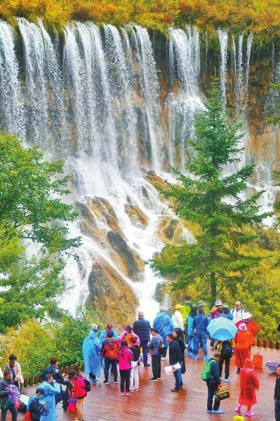 九寨溝景區今日起全域恢復開放。9月27日,游客在欣賞壯觀的諾日朗瀑布。四川日報全媒體記者華小峰攝