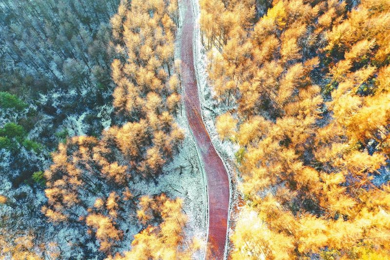 本月初的九寨溝,深紅、暗紅交替在山間,漫山遍野層林盡染,隨著冷空氣襲來,上周九寨溝迎來降雪,披上了一層清透潔白的“雪衣”,形成雪探彩林的別樣景致。這邊是冰雪和瀑布銀裝,那邊是斑斕彩林倒映在鏡面湖水,游客在半山彩林半山雪中感受浪漫與詩意。