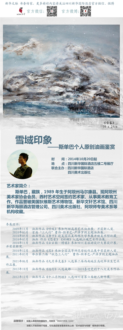 本批作品共計34幅,集合了作者對那片存在于藏區(qū)神秘且富有魅力雪域的點滴描繪。本次展出時間自2014年10月20日開始,藝術愛好者和收藏家可至新華國際酒店五樓二號展廳觀展,同時,住店客人可通過酒店智慧客房系統(tǒng)"藝術鑒賞與收藏"欄目進行觀看。